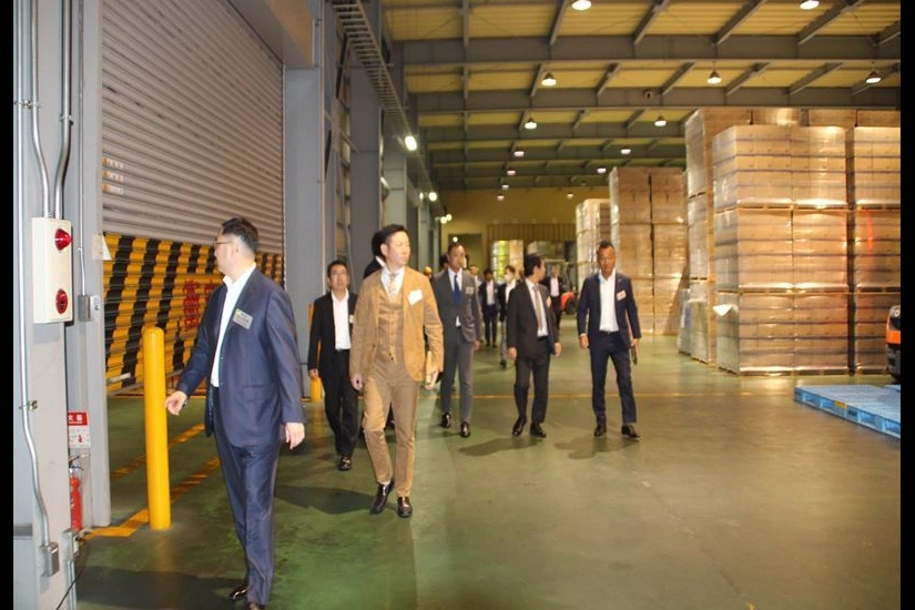 12時にホテルオークラ新潟に集合してバスで移動し、新入会員の川崎慶文氏(東部運送株式会社)の案内で、東部運送様の東港物流営業所(新潟県北蒲原郡)の倉庫を見学。新潟東港に近く、政府米や輸出入品などを主に保管している倉庫で、参加者たちは庫内の様子を熱心に見学し、現場の方に質問をしていた。