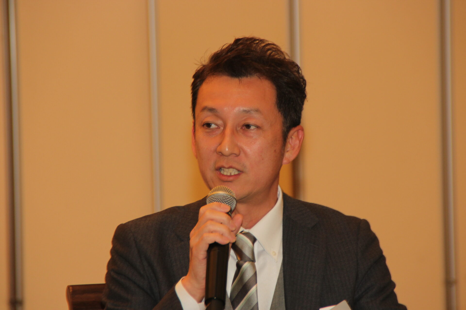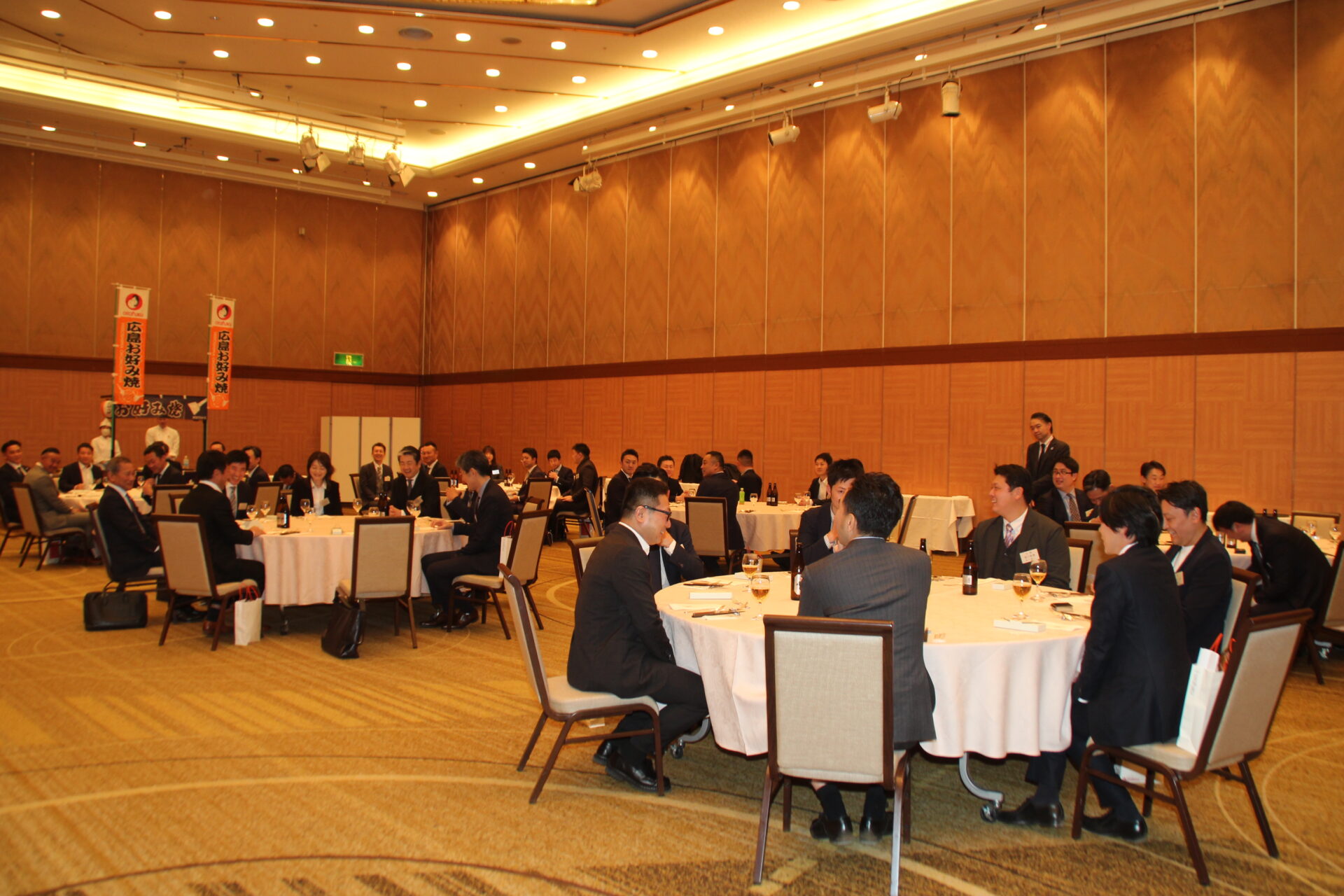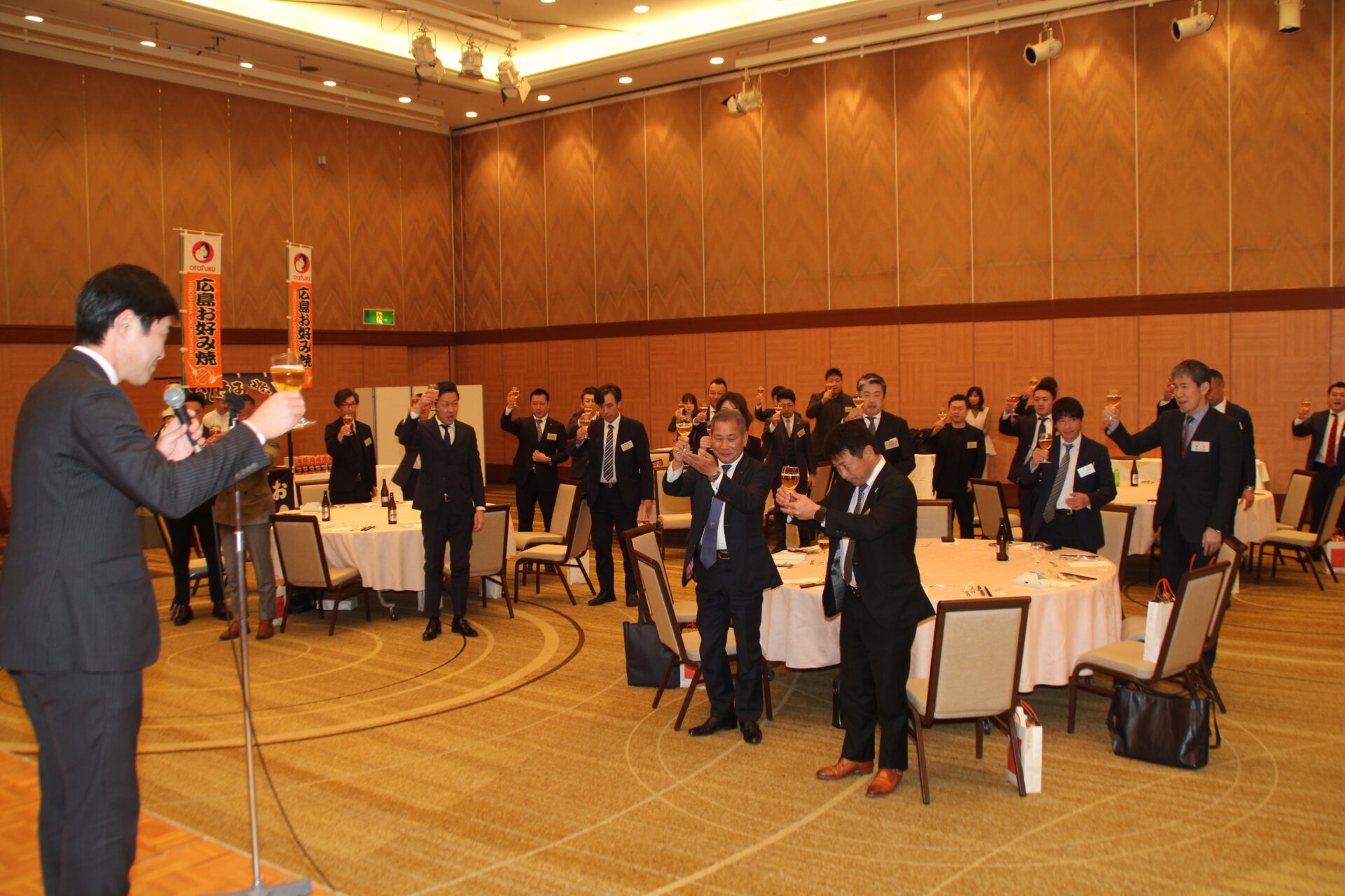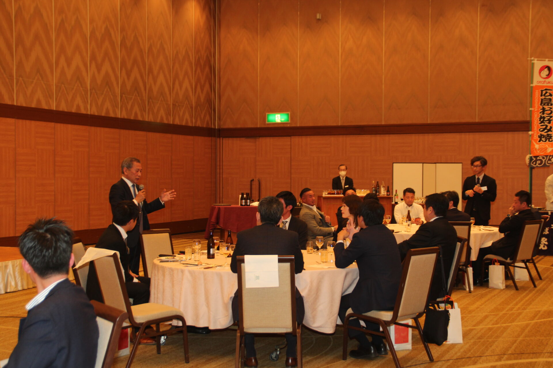 地元広島の喜多村祐輔副会長(丸加海陸運輸)の司会により、懇親会が開催されました。オタフクソース様のご厚意によりお好み焼き屋台が会場内に設営され、皆で出来立てのお好み焼きを楽しみました。また、佐々木会長への質問コーナーでは質問が途切れることなく、さながら講演会の延長のような熱い時間となりました。
