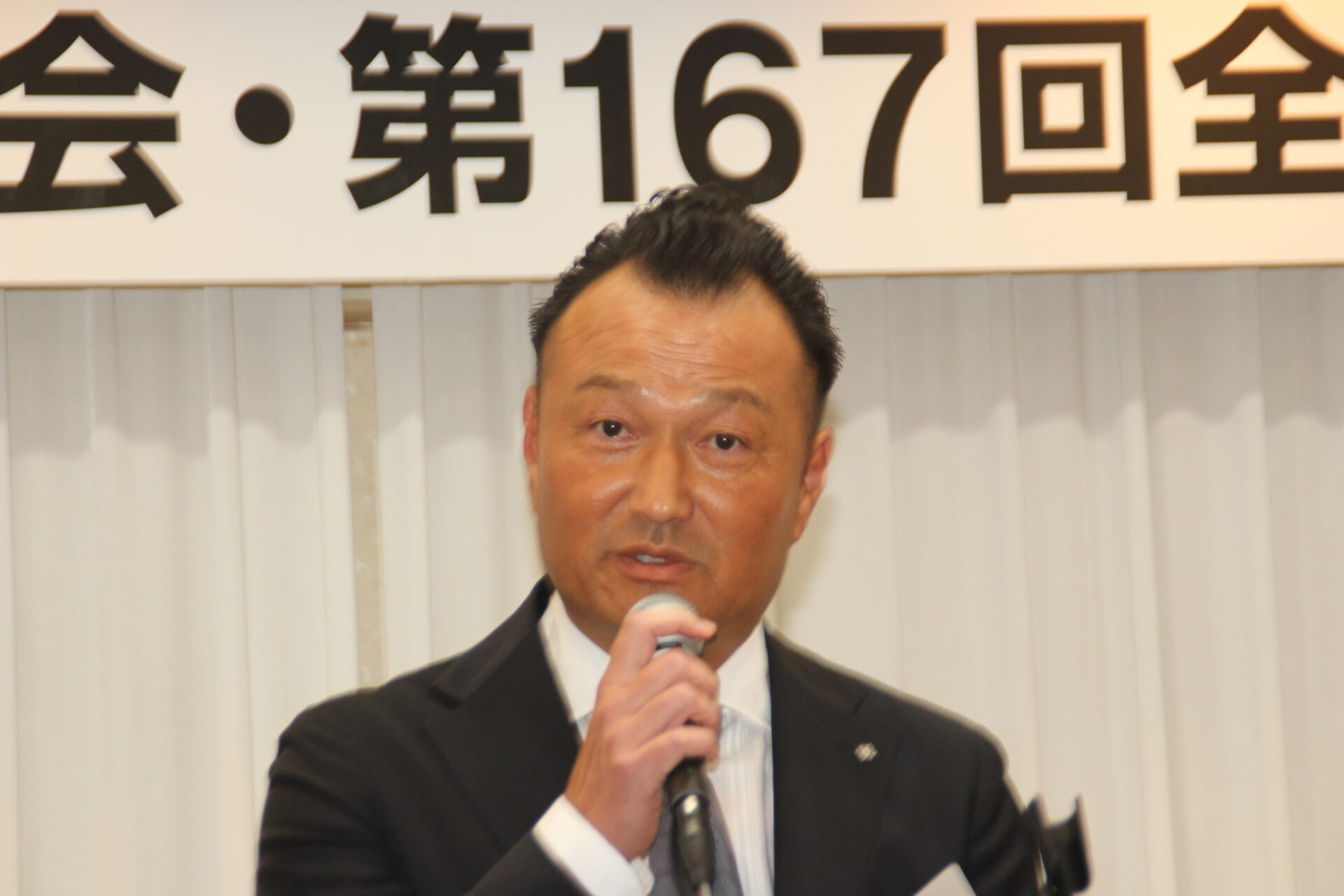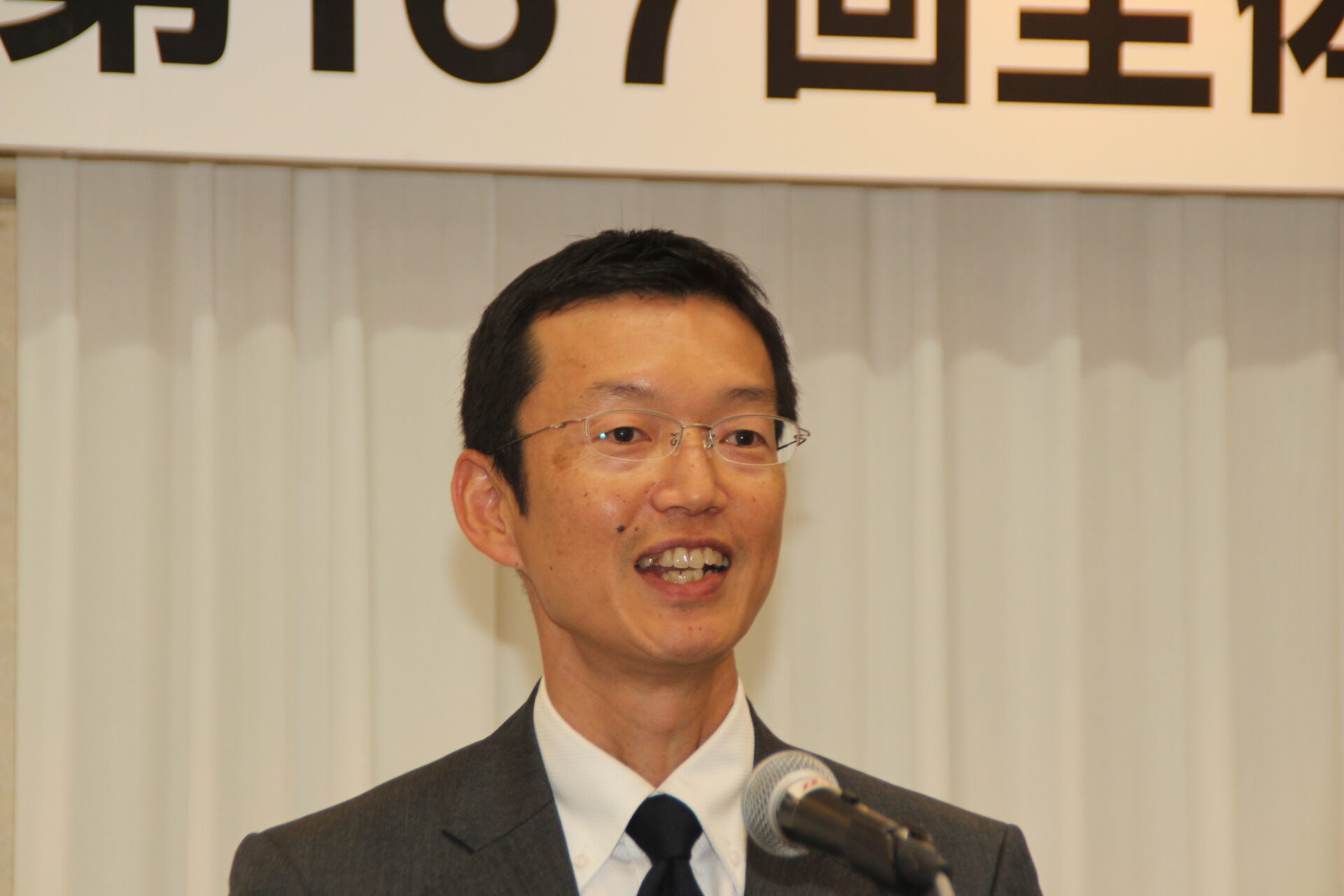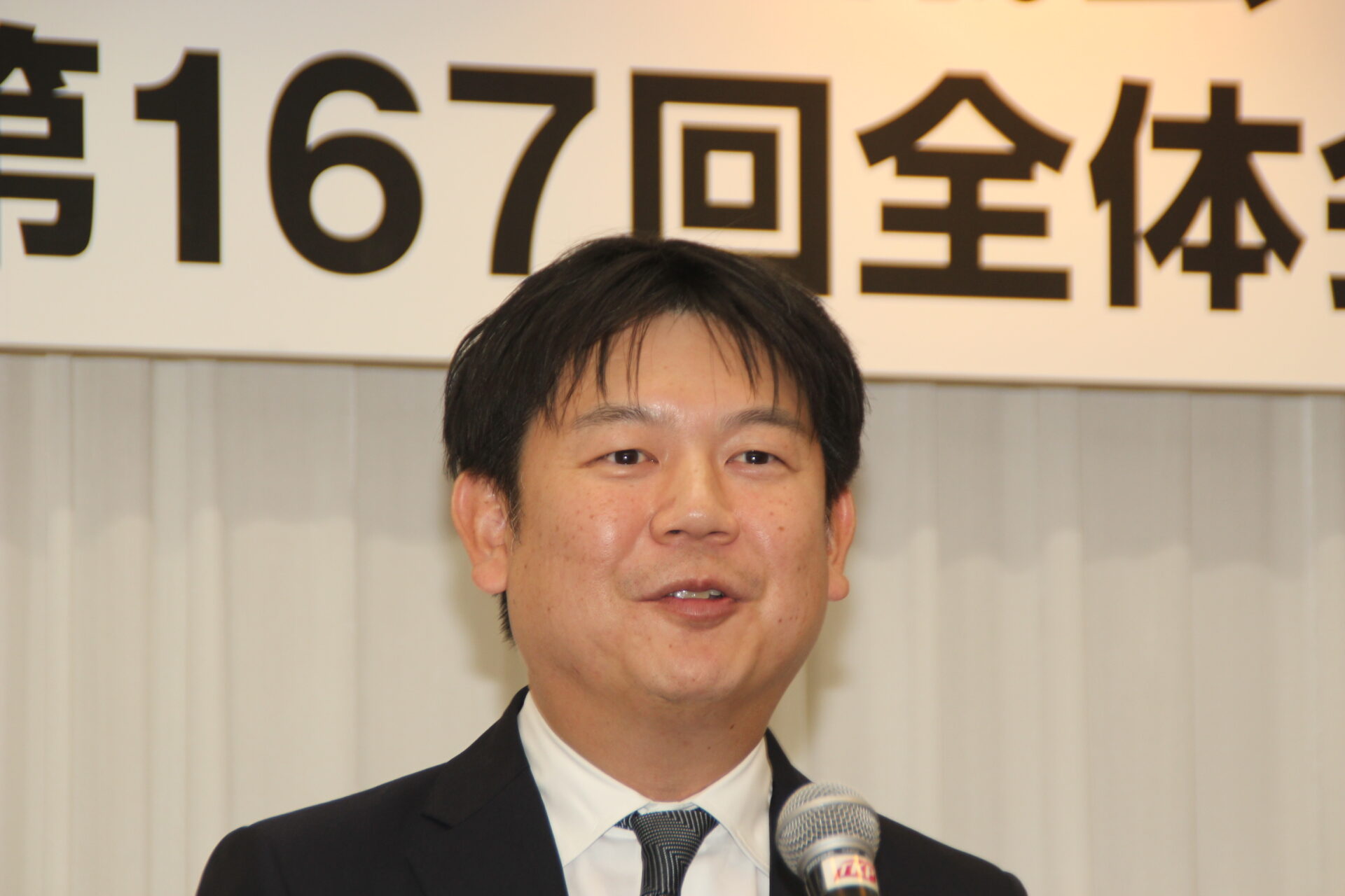 総会に続き、阿部一皓新運営委員長(フコク)の司会により第167回全体会が開催されました。来賓を代表して米田浩日本倉庫協会理事長が、「谷川新会長のご就任おめでとうございます。日本倉庫協会のいろいろな活動においても、倉青協OBの方々がたいへんご活躍されています。協会活動というのはまさにボランティア精神で成り立っており、倉青協で培われてきた“倉庫業を思い、仲間を大切にする精神”が、卒業後もさまざまな場面でいかんなく発揮されていることを皆さまにお伝えしておきたいと思います」とあいさつしました。