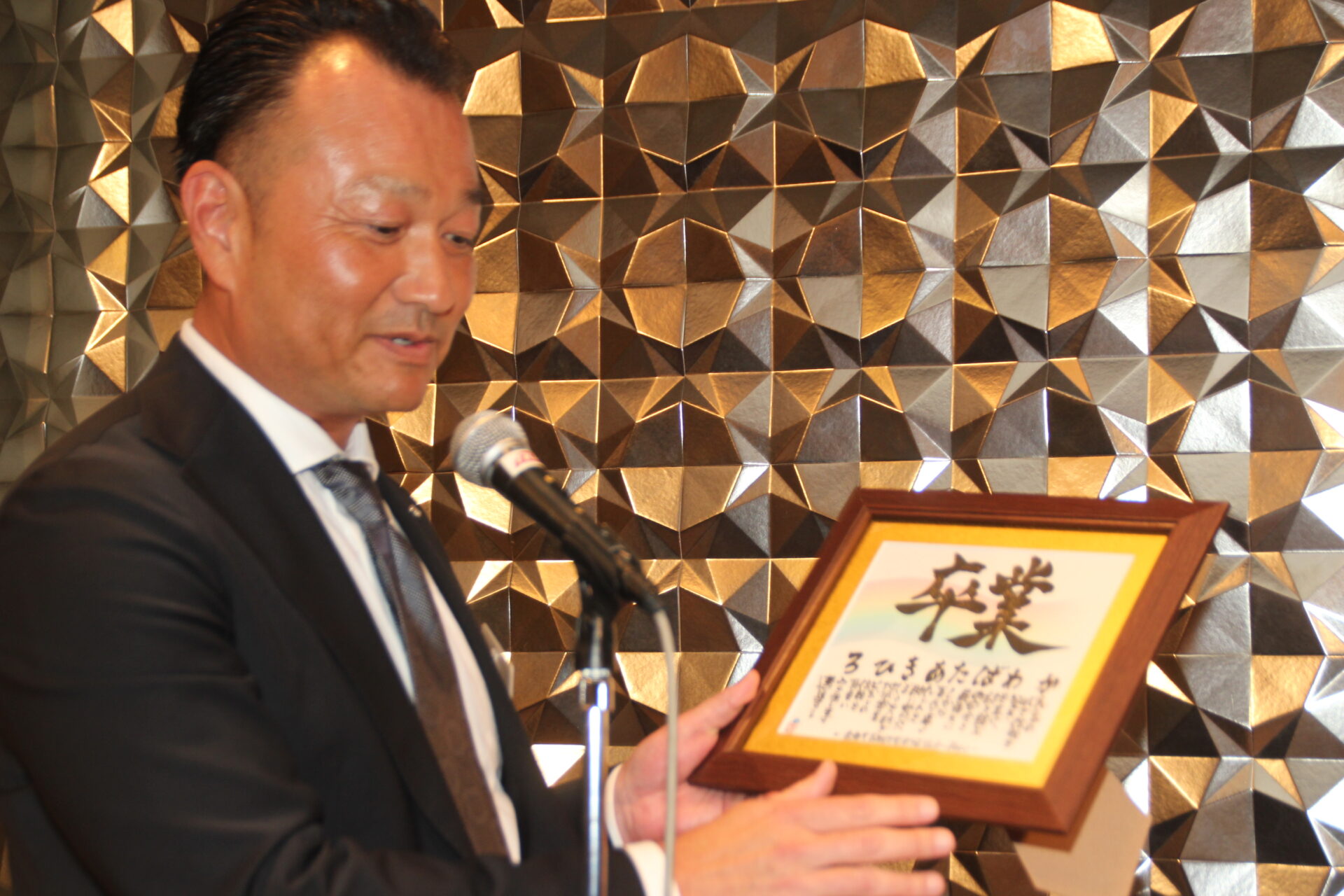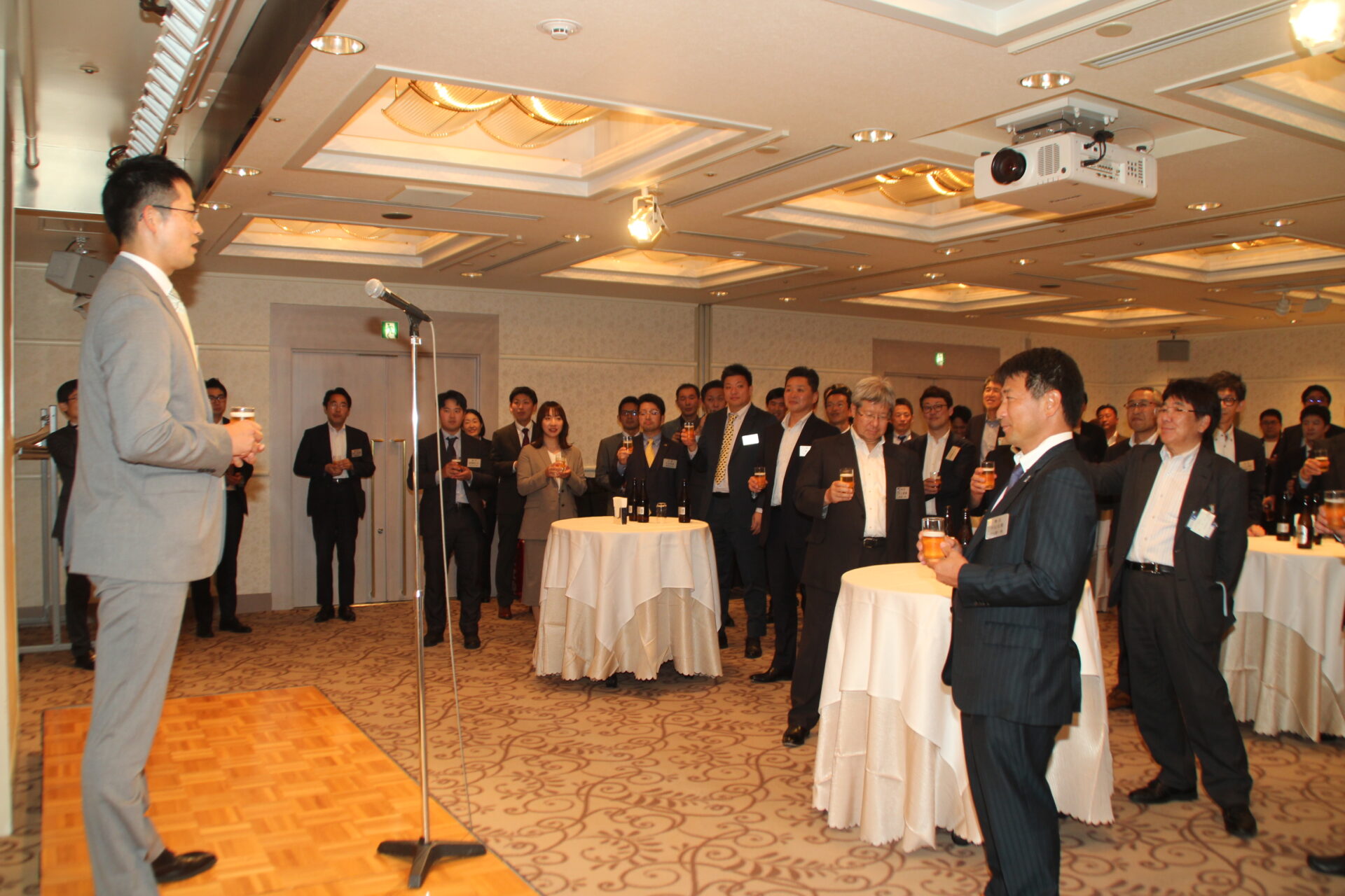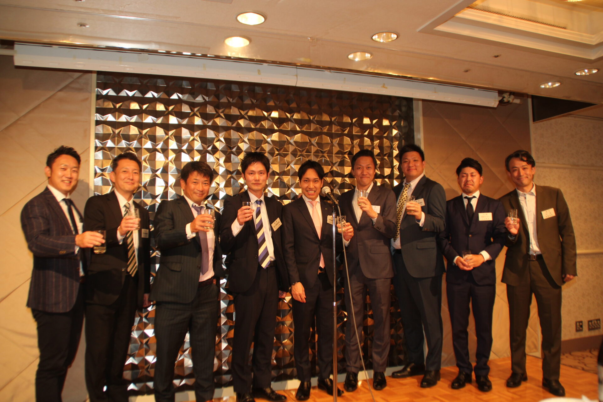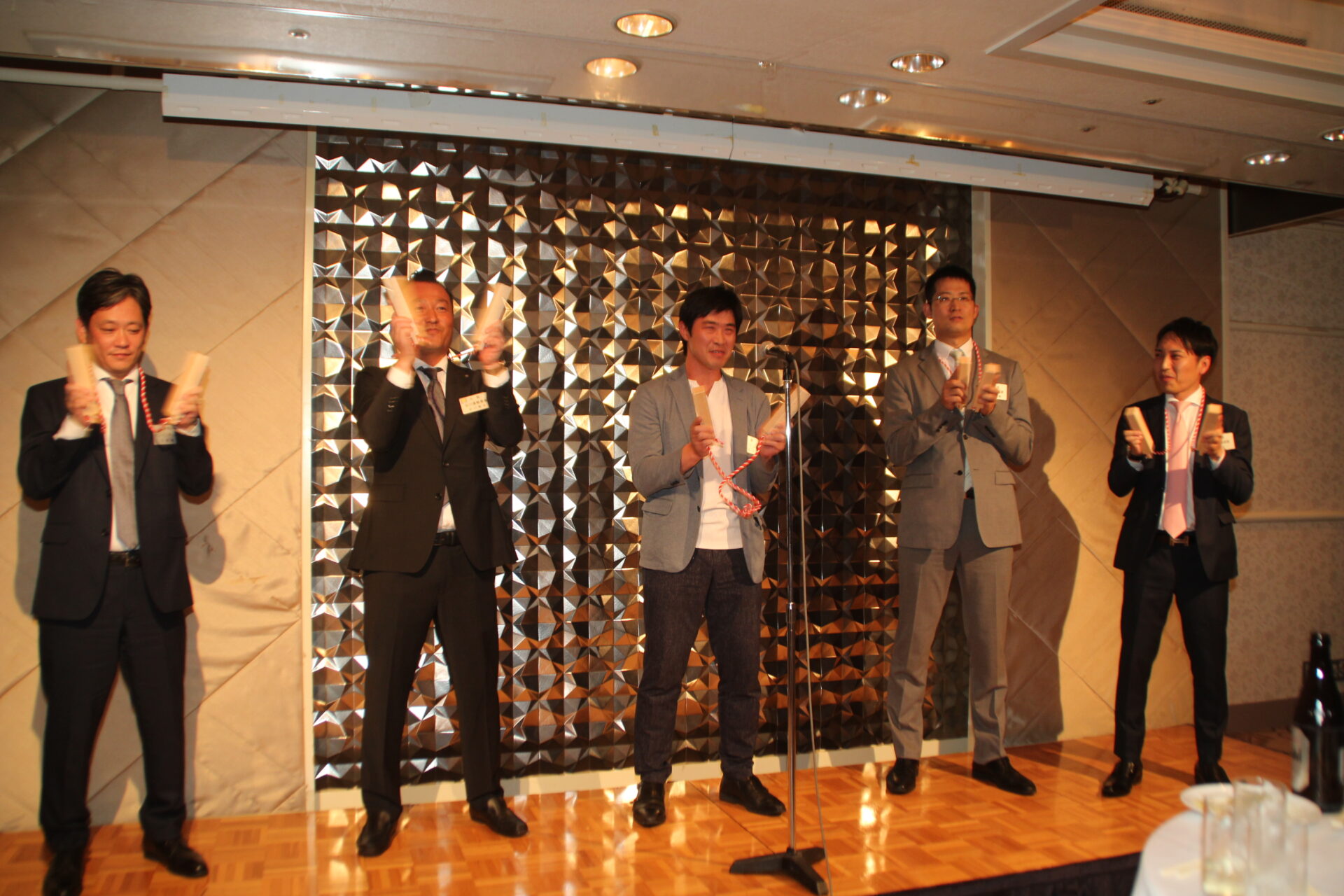 懇親会は、髙橋大輔 新副会長の乾杯に始まり、新副会長、新委員長をはじめ、新入会や新たに社長に就任された方々が次々と登壇しあいさつしました。終盤では当総会で卒業される皆さんに谷川新会長から記念品の贈答があり、一人一人が倉青協への思いを語りました。最後は会長の音頭による大阪締めで、景気よく閉会となりました。