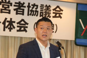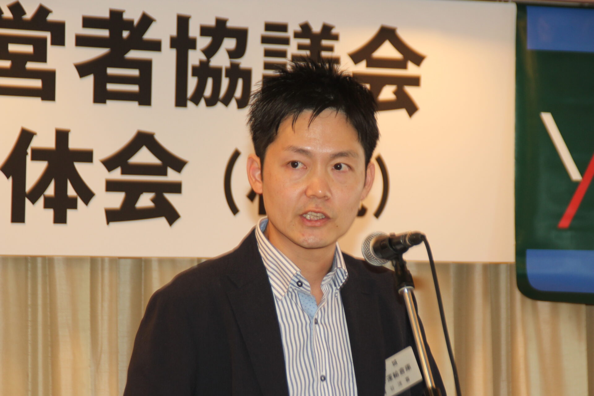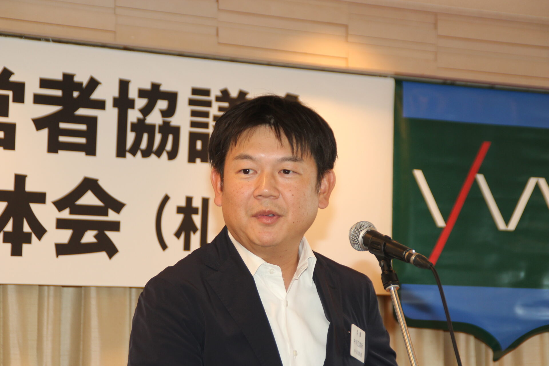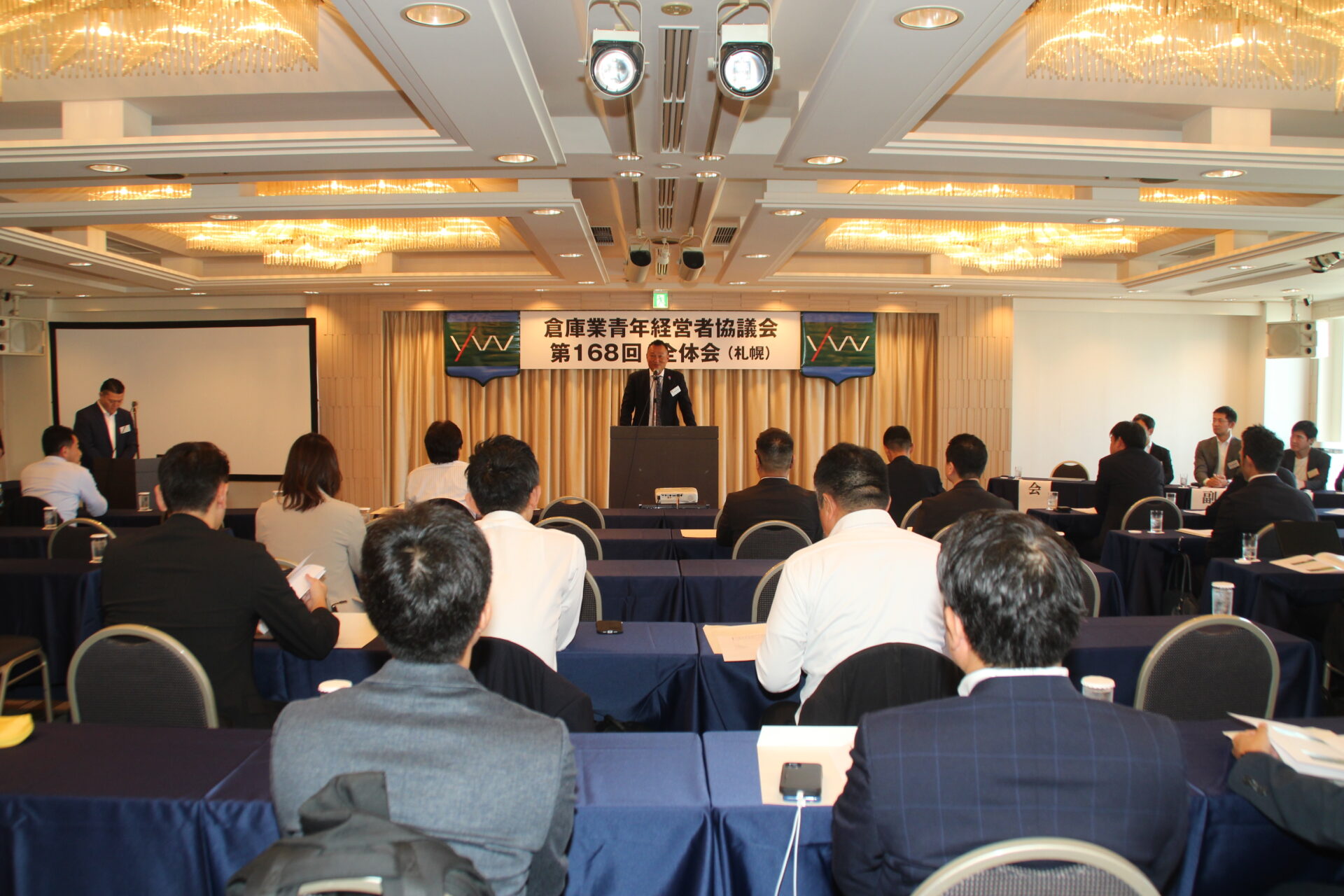 第168回全体会は、阿部一皓運営委員長(フコク)の司会進行のもと、はじめに谷川隆史会長(谷川運輸倉庫)が「私が19年前に倉青協に入会して、初めて参加した全体会が札幌でした。当時出会った仲間たちとは、今も親密な関係を築いています。倉青協は参加してこそ価値が生まれる場です。皆さんも気の合う仲間を見つけてどんどん交流を深めてください」とあいさつしました。