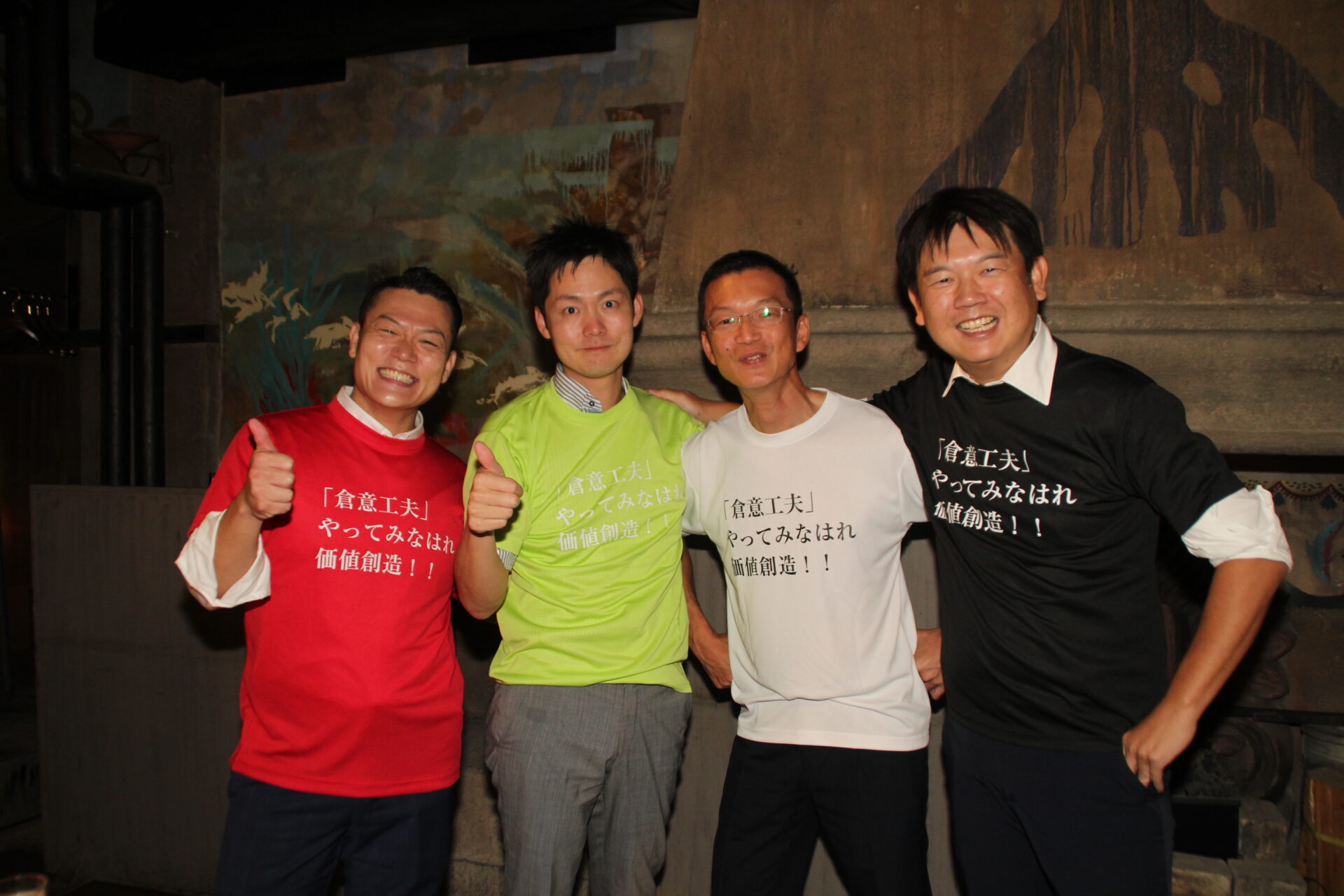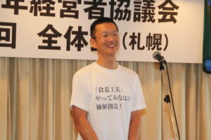 続いて、運営・組織・企業交流・広報委員会の各委員長から委員会の活動報告がありました。伊藤孝郎広報委員長(伊藤倉庫)は、倉青協スローガン<「倉意工夫」 やってみなはれ 価値創造!!>をプリントしたお手製Tシャツを着て、広報委員会活動への意気込みを語りました。
