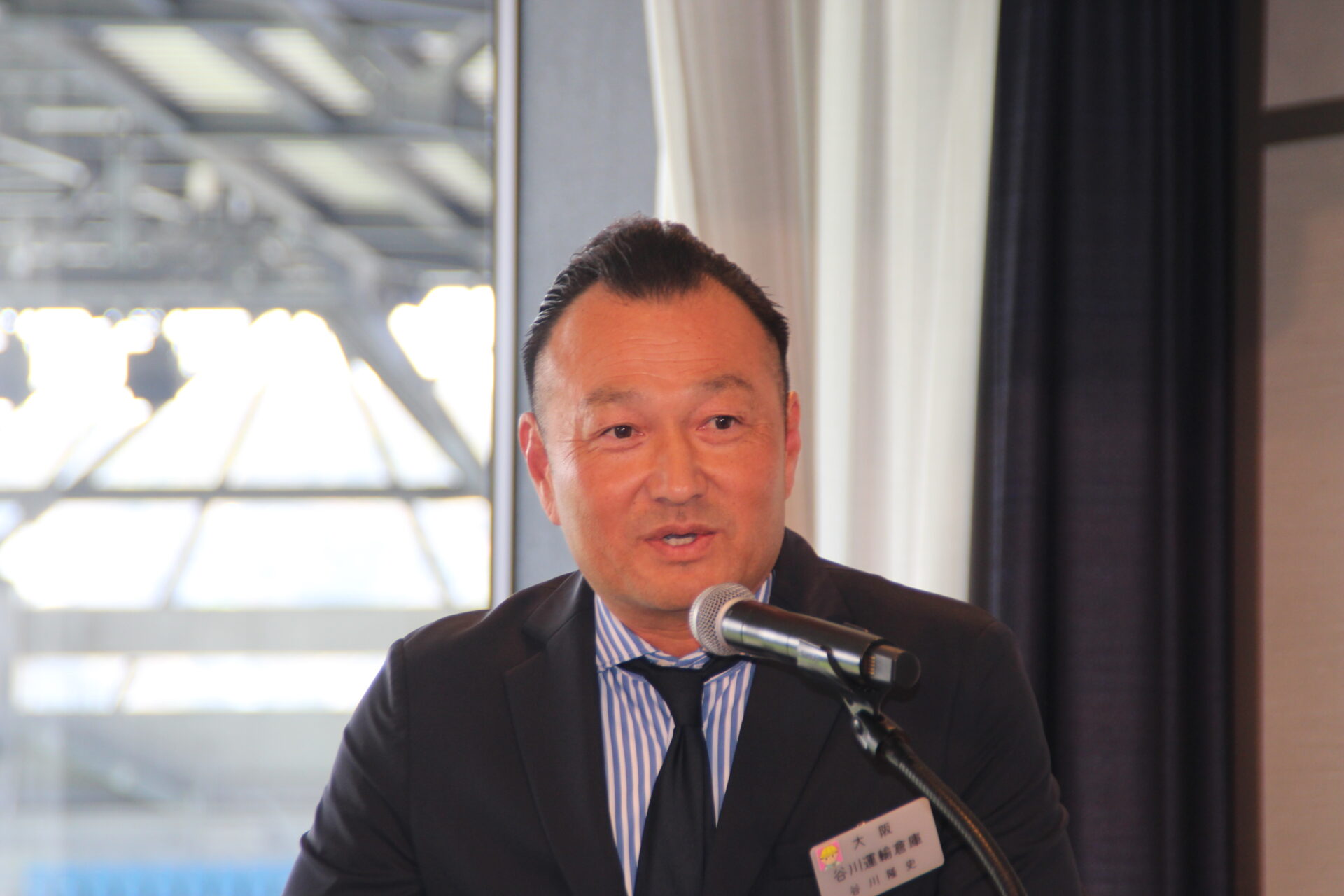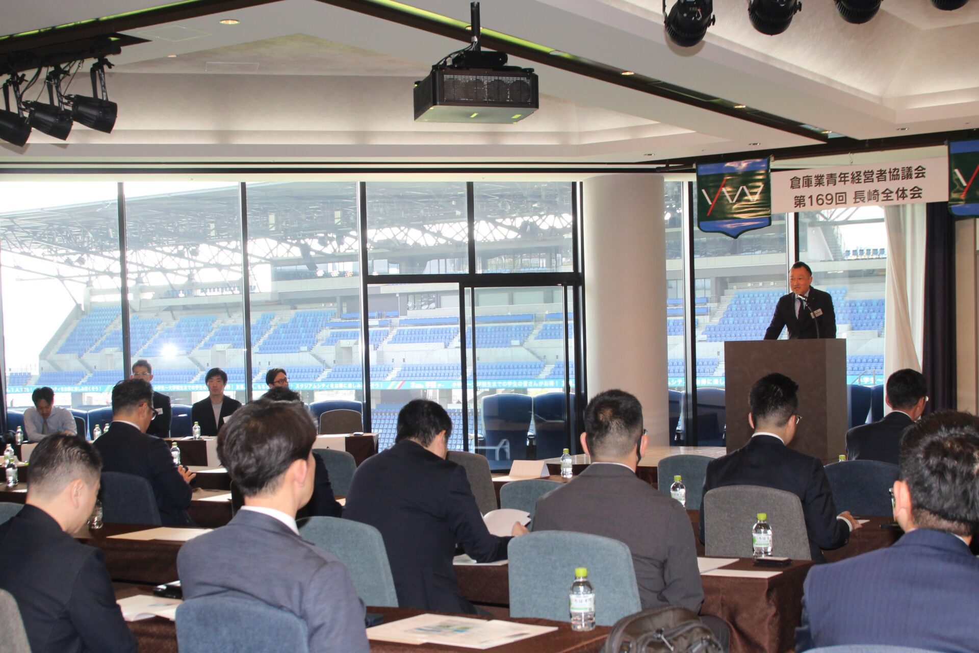 はじめに谷川隆史会長(谷川運輸倉庫)が登壇し、「約9年ぶりとなる長崎での全体会を、スタジアムを見渡すこの素晴らしい会場で開催できたことをうれしく思います。昨今、改めて現場労働者の重要性が注目され、“物流が止まれば社会が止まる、倉庫が機能しなければ経済が回らない”という僕らにとって当たり前の事実が、ようやく世の中に認識され始めました。そうした中で倉青協の果たす役割は単なる勉強会というより、次の時代を切り拓く原動力そのものだと思っています」と述べました。