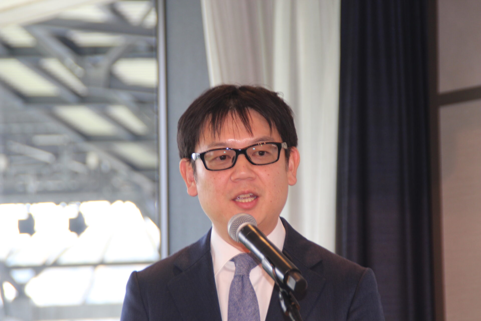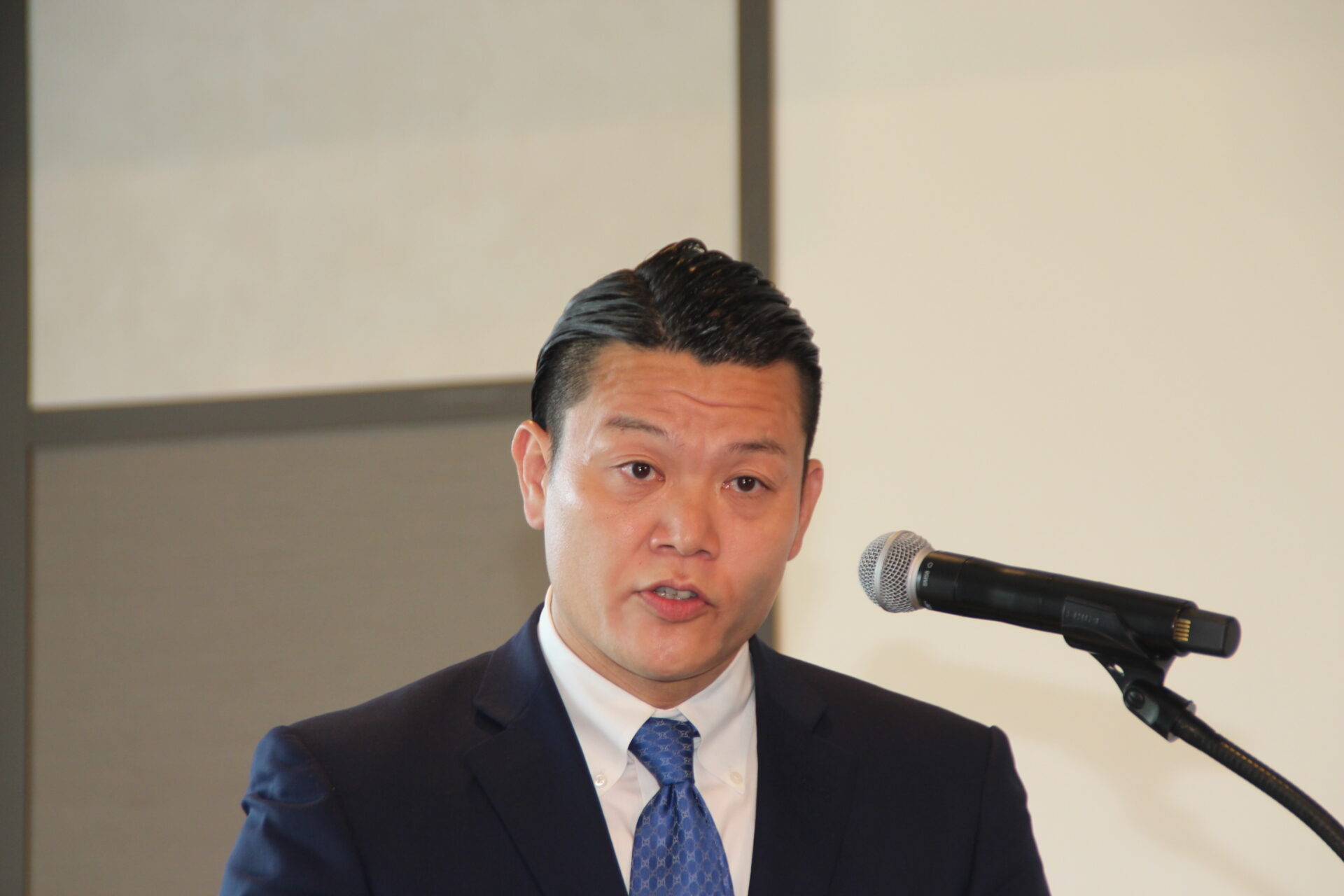 来賓には、一般社団法人日本倉庫協会から米田浩理事長と同総務部課長代理の石掛敬子氏を迎え、米田理事長が「私は倉青協の全体会に皆勤賞で参加しています。それは、人と人とのつながりが何より大事だと感じているからです。倉青協も日倉協も目指すところは一緒であり、互いに情報共有し協力し合っていければと願っています」とあいさつし、日倉協で新たに立ち上げた人材確保委員会や入会パンフレットを紹介するとともに、最近の倉庫税制の動きなどについて説明しました。