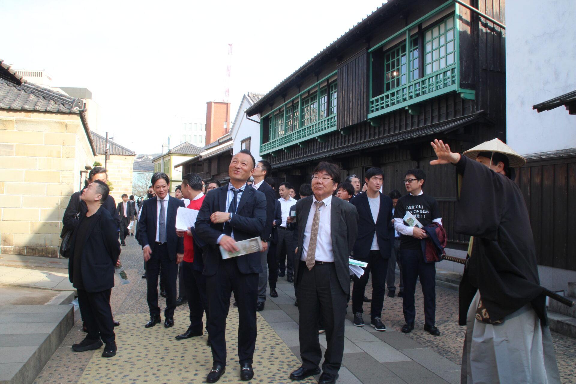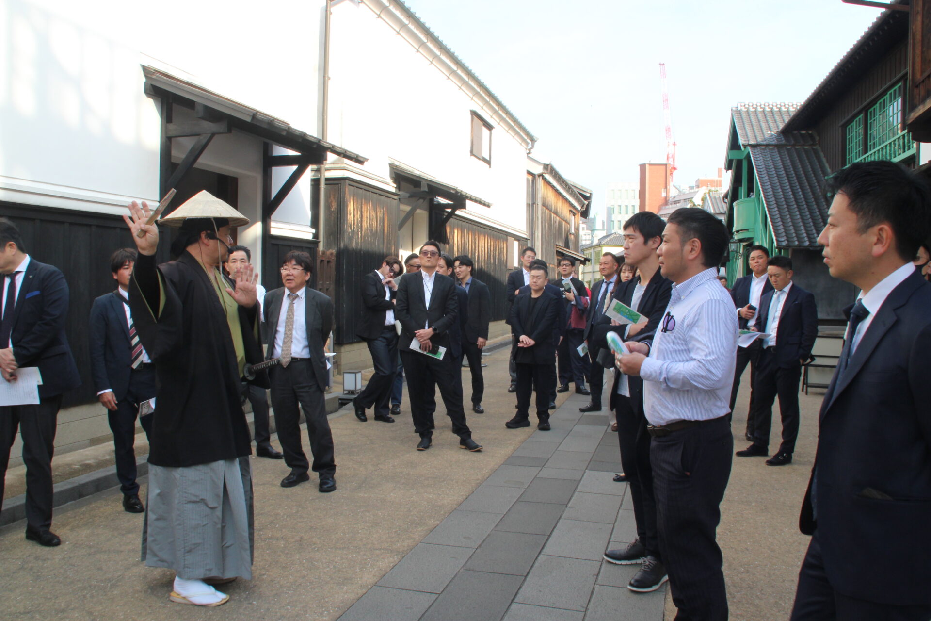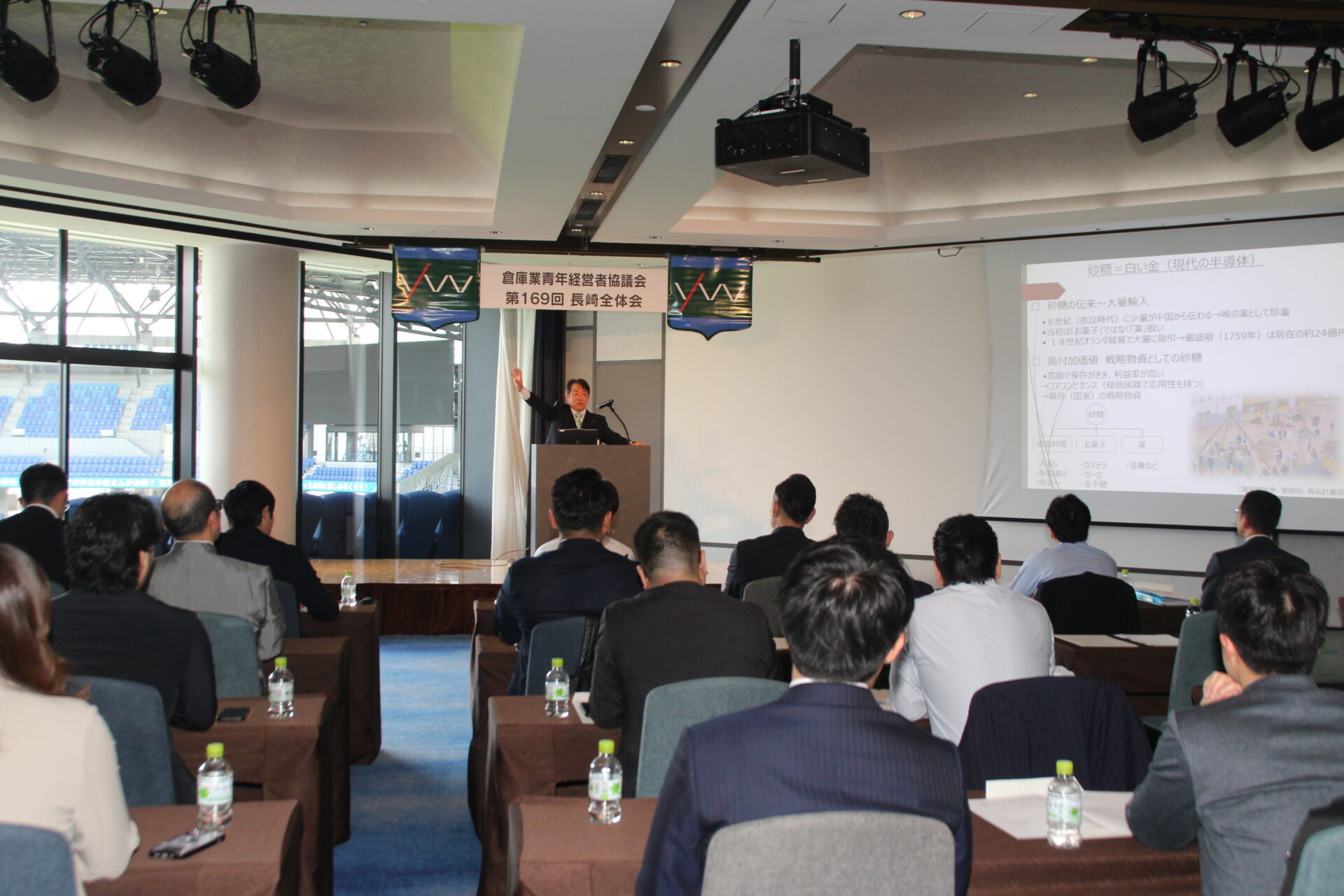 2026(令和8)年3月26日(木)、長崎の地に会員40名が参集し、第169回全体会、講演会、見学会が開催されました。会場はサッカースタジアムに直結したスタジアムシティホテル長崎(長崎市)。倉青協OBの牧社長による講演で、江戸から今につながる長崎の歴史を学び、その後、出島に赴いて往年の貿易の様子や文化に触れ、さらに夜は老舗「四海樓」にて懇親会を行うなど、長崎の魅力を存分に満喫する全体会となりました。
